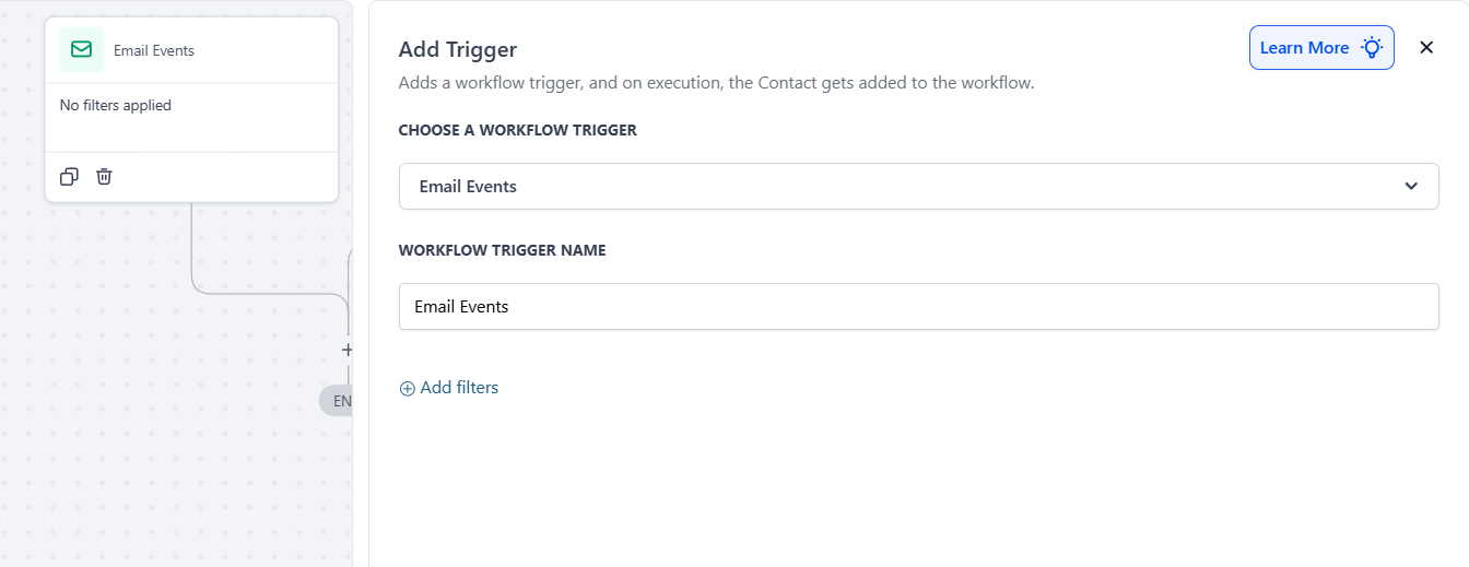 - Add the Email Events trigger, filter for “Opened,” and save the trigger.