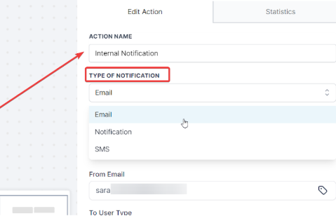 - Add the Internal Notification action, select email for the type of notification, select the user type, and customize the email with a timestamp and other custom values of preference.