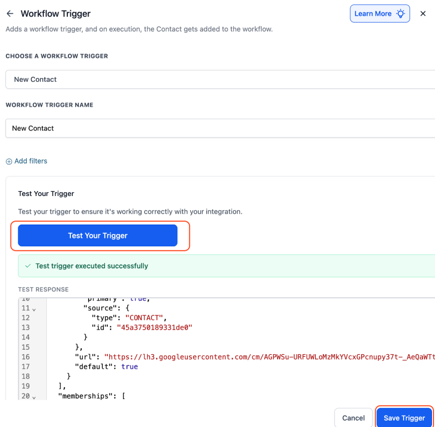 Answer: When setting up your trigger in the workflow builder, you can use the “Test Trigger” button. This feature fetches sample data from your account, allowing you to verify that the information is pulling through correctly and enabling accurate field mapping.