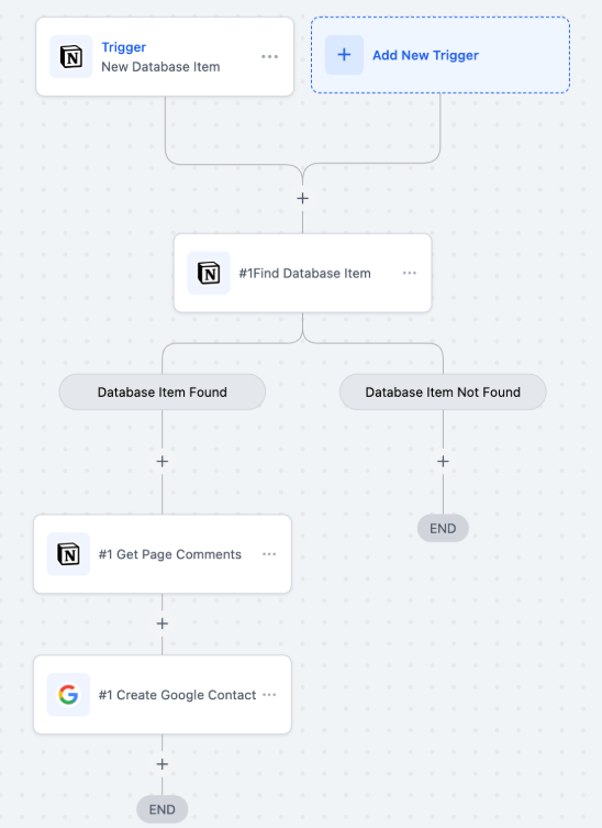 Example: When a new client record is added to a Notion database, a Google Contact is created and grouped accordingly.