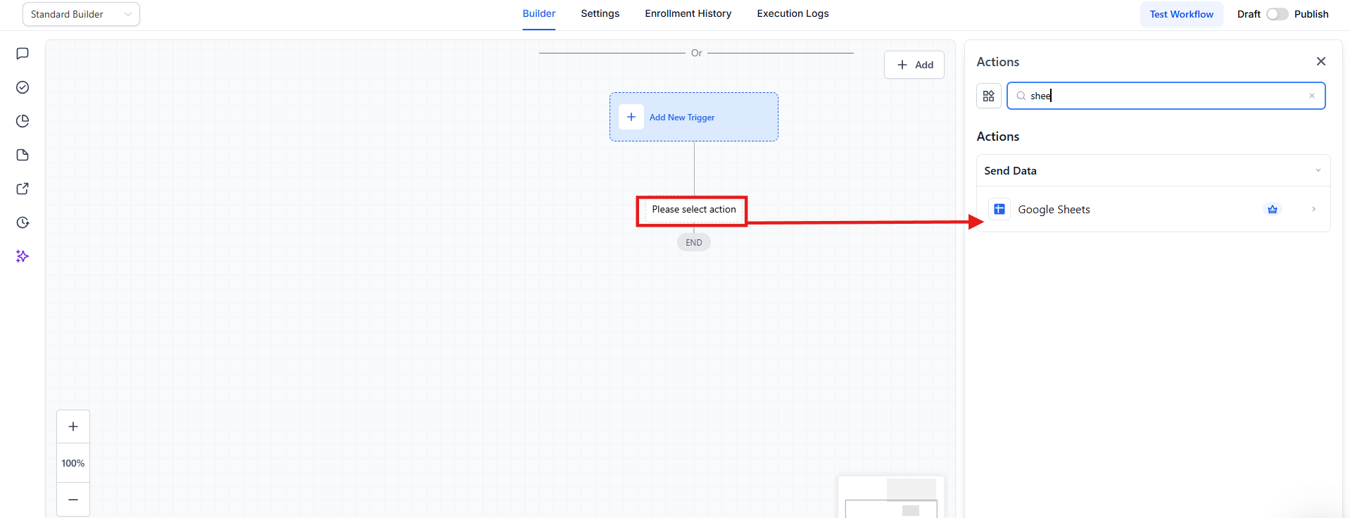 - Select Google Sheets Action: Choose the Google Sheets action category (note that this is a premium action).