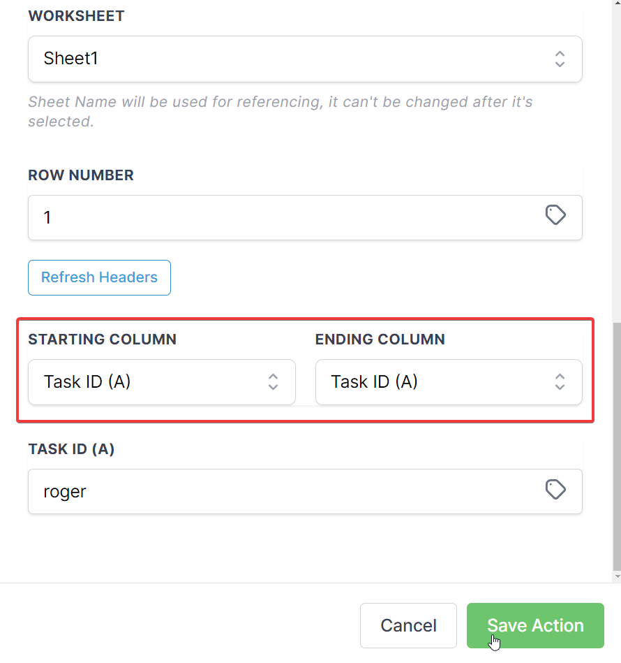 Answer: To update a specific row, you must select the same starting and ending columns in the action configuration. This ensures the system targets the exact range within that specific row number.
