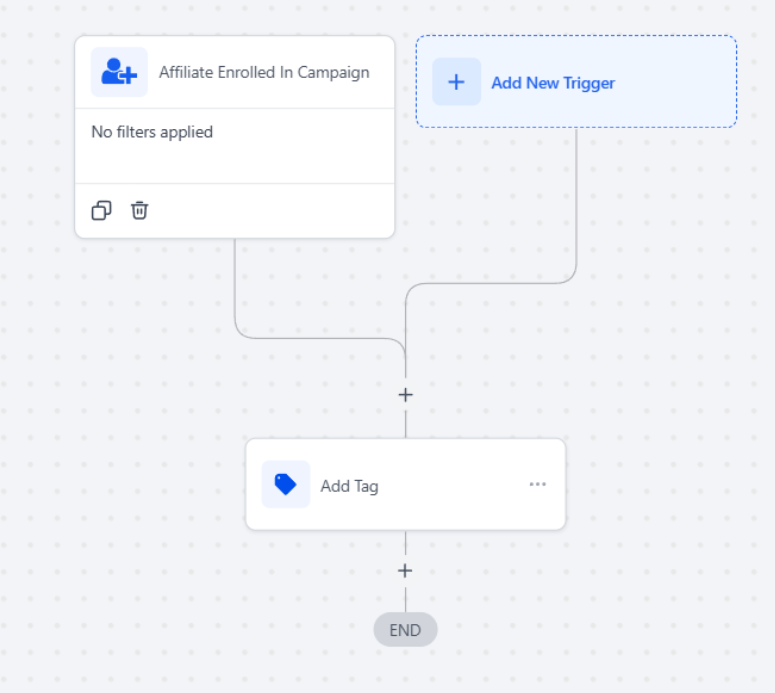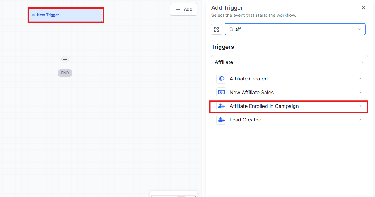 Section titled “Step 2: Set Up the Affiliate Enrollment Trigger”1- Click on Add New Trigger within the workflow.