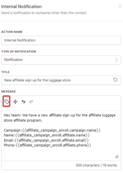 Section titled “Step 5: Internal Notifications”- Set up an Internal Notification to notify your team whenever a new affiliate joins. Include the affiliate’s name, email, phone number, and campaign details.