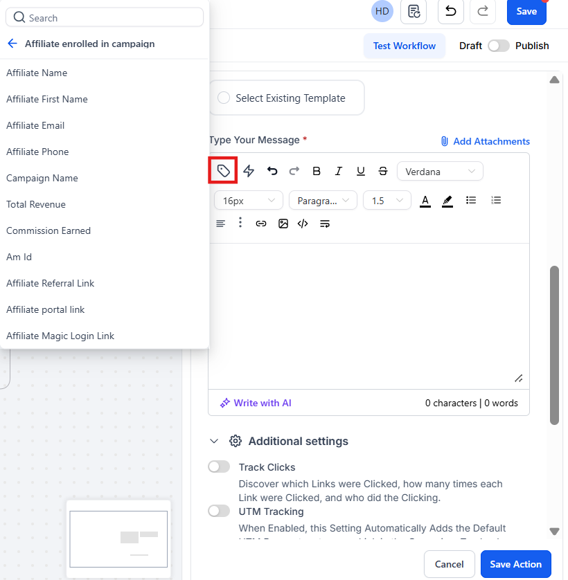 Question: How can I track which campaign each affiliate belongs to? Answer: Use tags within the workflow to label each affiliate based on the campaign they are associated with. This allows for segmentation and easy reference when sending targeted communications.