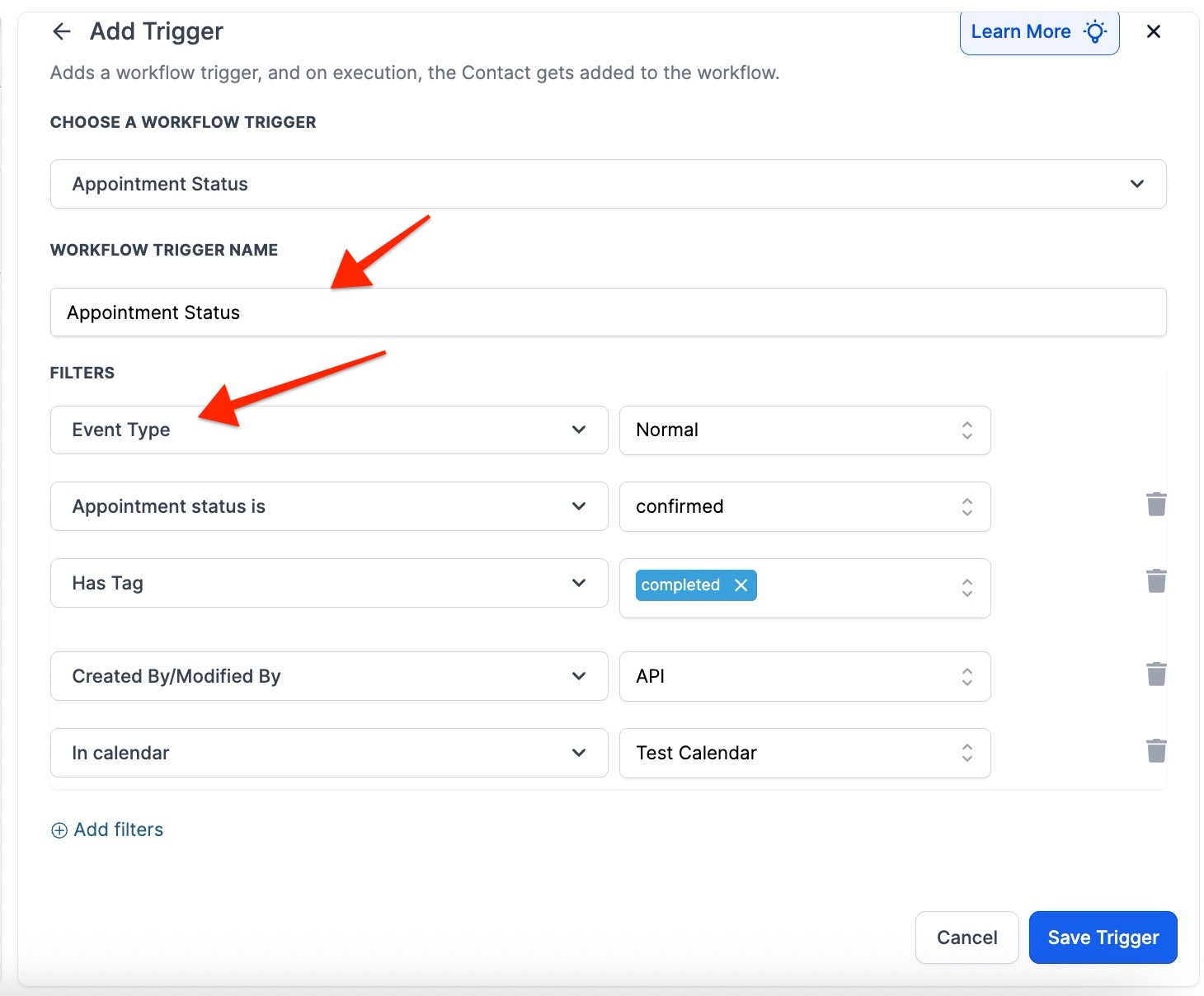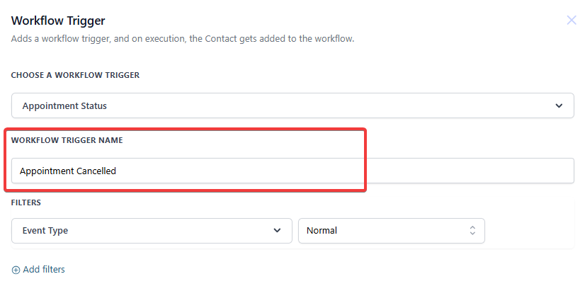 - Under Filters, specify appointment types and statuses that will trigger the workflow.