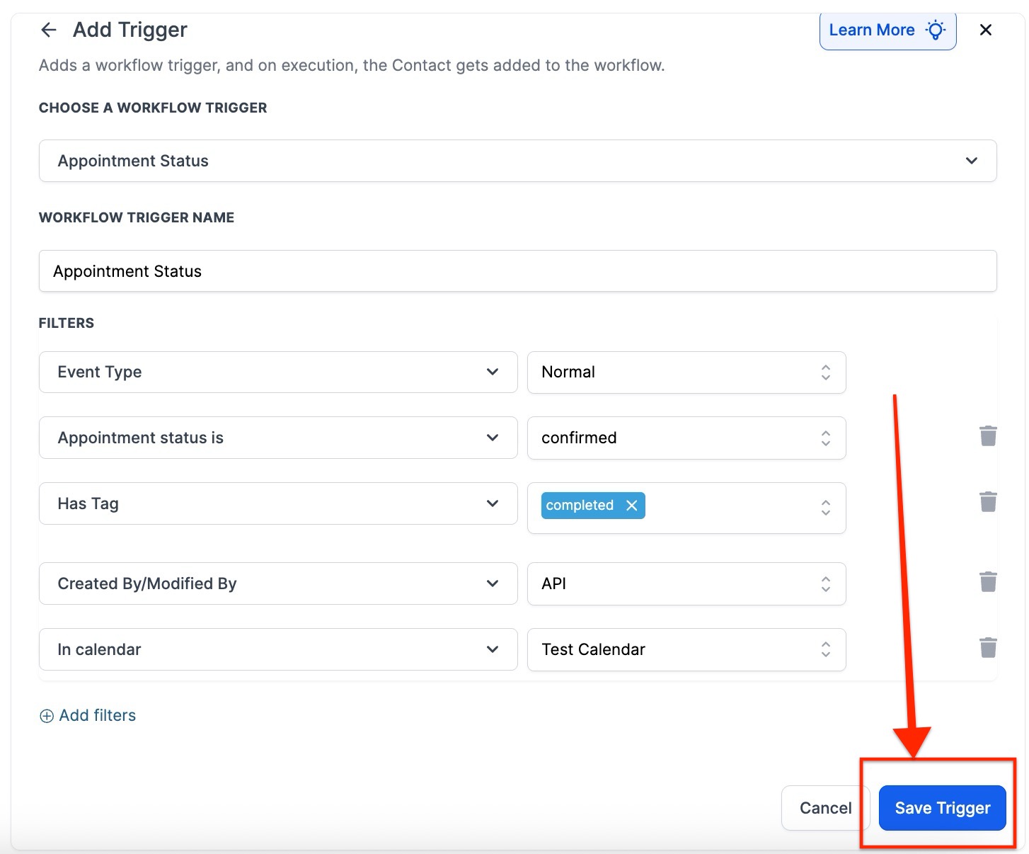 Under Filters, specify which appointments and appointment statuses should trigger this workflow