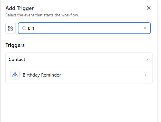 - Select Birthday Reminder in the Contact section of the Workflow Triggers Menu or use the search feature
