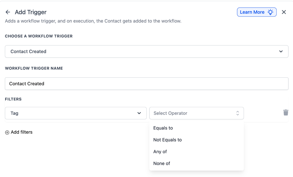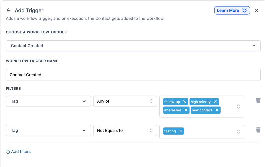 Multiple Tag Instances: You can add multiple “Tag” filter rows within one trigger. These use AND logic, allowing you to create precise exclusions (e.g., Tag Equals “Lead” AND Tag Not equals “Low Quality”).