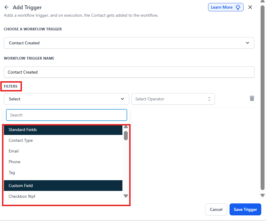 - Created via Source: This filter allows you to distinguish contacts based on their method of entry into the system. You can define whether the workflow should activate only for contacts manually added, submitted through a form, or imported via API. This ensures that automation is not triggered for contacts that don’t need immediate attention, such as those from bulk imports.