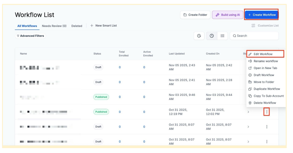 Section titled “**Step 1:**Navigate to the Automation tab and Start a new workflow or edit an existing one”