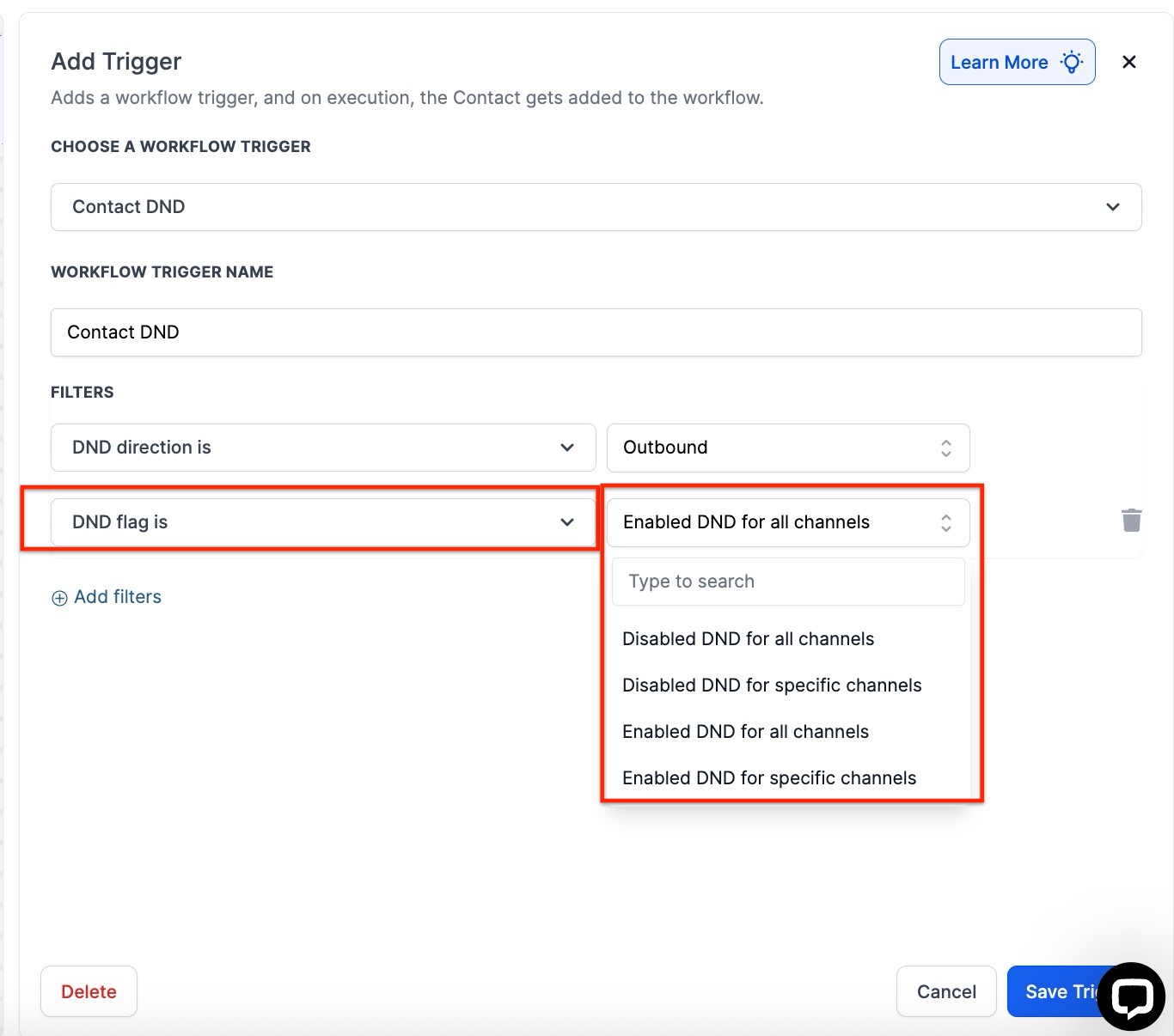 The Contact DND Workflow Trigger can be used for any actions where a contact enables or disables Do-Not-Disturb (DND) for any communication channels. When a DND event occurs, the associated contact will be added to the workflow, allowing you to set up any number of follow-up actions. This article will outline setting up a Workflow with the Contact DND Workflow Trigger.