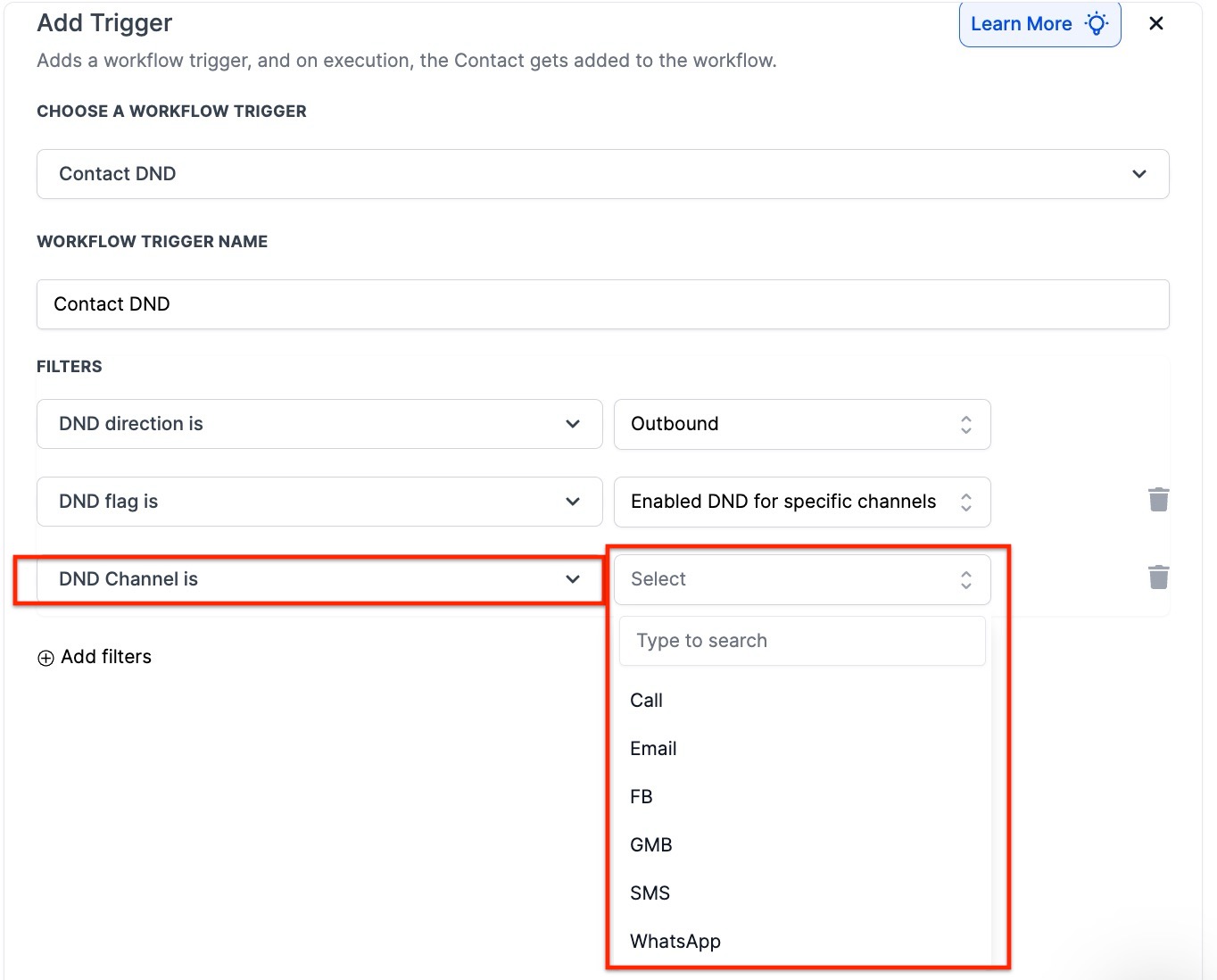- Press + Add filters again and in the first drop-down select DND Channel is and then in the second drop-down select your chosen channel for this workflow. This can be Call, Email, FB, GMB, SMS or WhatsApp