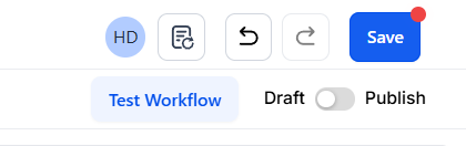 Section titled “Step 4: Press Save in the top right corner of your browser to save the workflow”- If your Workflow is ready to be enabled, make sure the toggle switch under Save is set to Publish