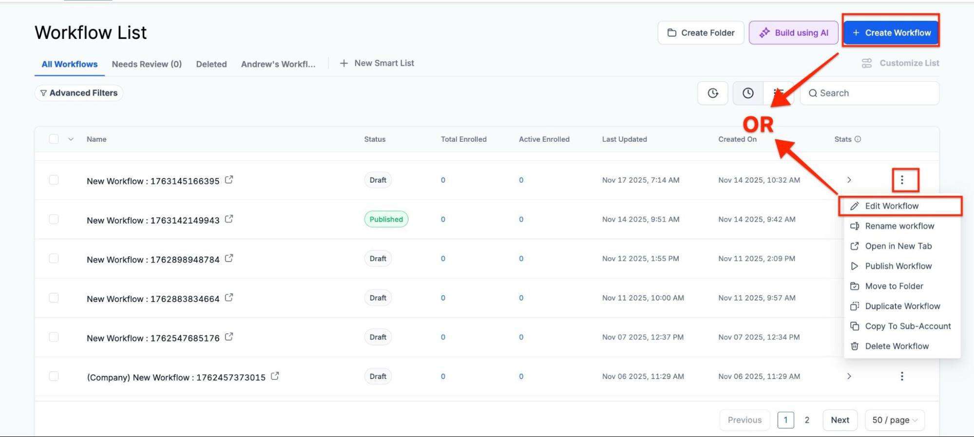 Section titled “Accessing the Workflow Builder: ”Navigate to Automation on the left > Workflows on the top, and create a new workflow or edit an existing.