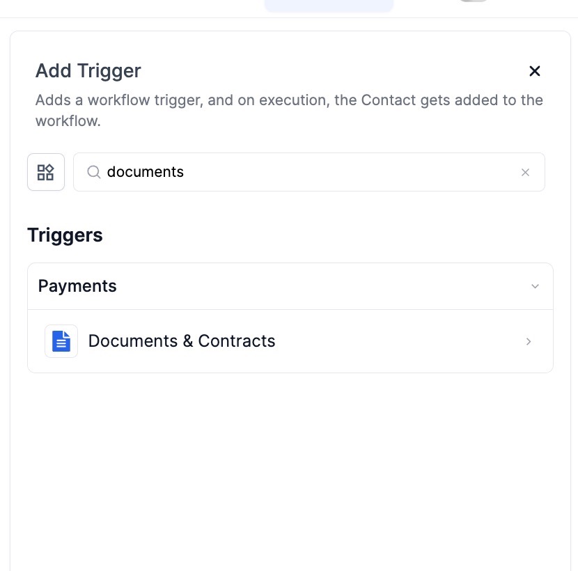 Section titled “Selecting the Trigger:”Choose the “Documents & Contracts” trigger option to initiate the workflow based on document or contract activity.