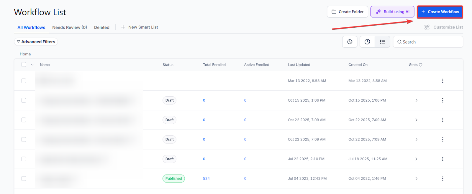 - Go to Automation on the left > Workflows section at the top, and click on + Create Workflow.