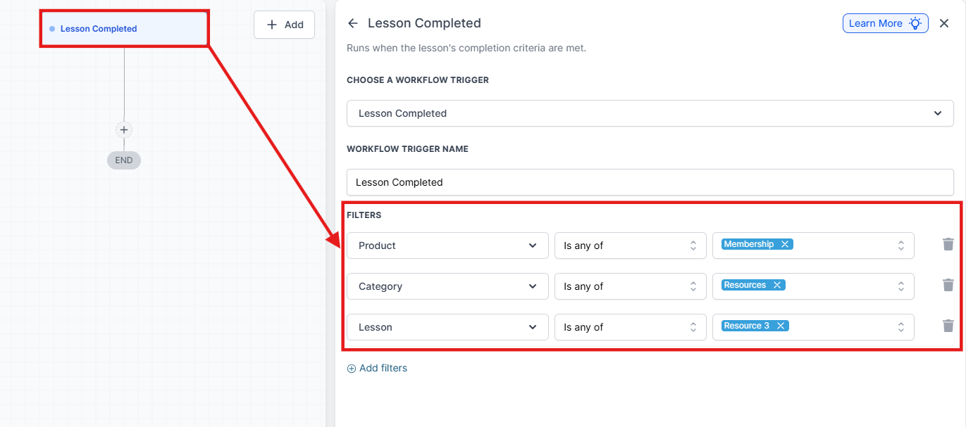 - Add the trigger for “Lesson Completed” from the list of available triggers. You can add filters to further customize the workflow, such as firing off a specific lesson.