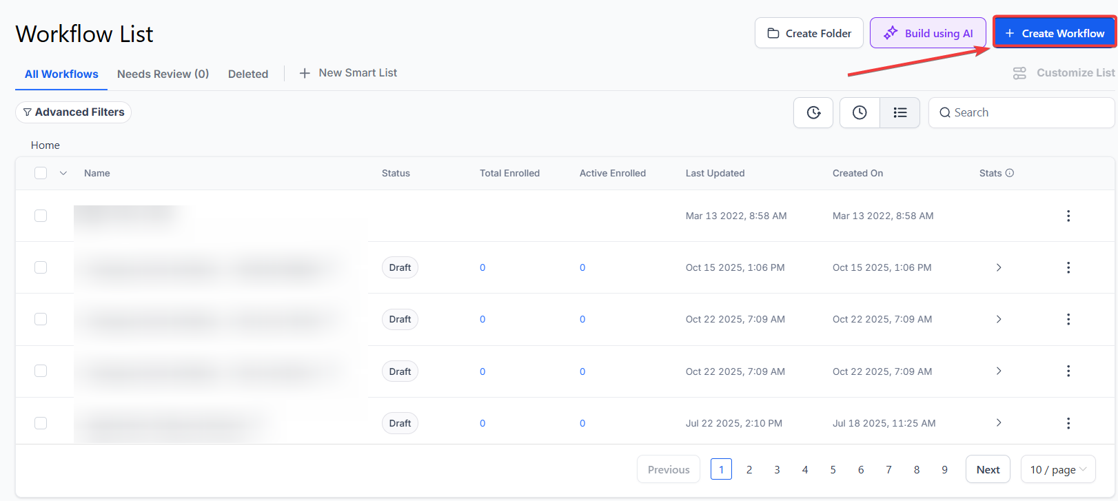 - Access Workflow Builder: Navigate to Automation on the left and Workflows on the top and create a new workflow.