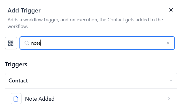 Answer: To use this trigger, start by creating a new workflow or editing an existing one. Add the “Note Added” trigger from the Contact section of the Workflow Triggers Menu. This will start the workflow whenever a new note is added to a contact.