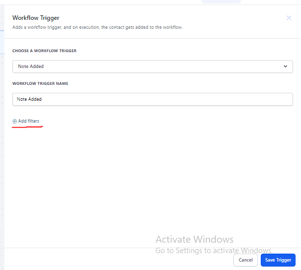 - Step 2: Click “Add New Workflow Trigger” and select “Note Added” from the Contact section.