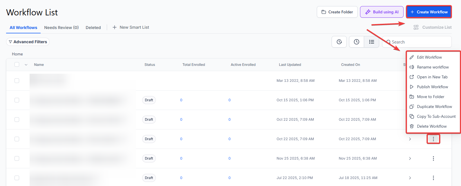 Section titled “Step 1: Start a new workflow or edit an existing one”- Navigate to Automation > Workflows and create a new workflow or edit an existing one.