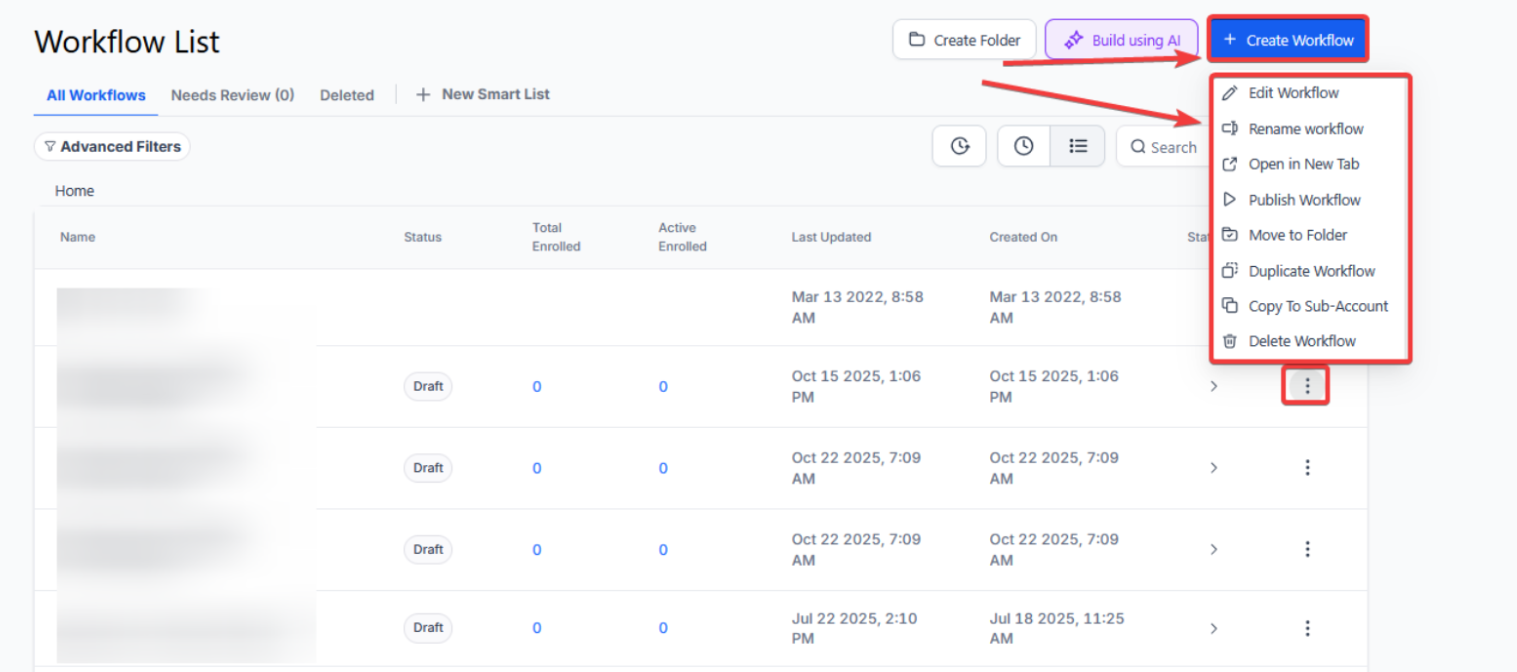 Section titled “Step 1: Start a new workflow or edit an existing one”- Navigate to Automation on the left > Workflows at the top and choose to start a new workflow or edit an existing workflow.