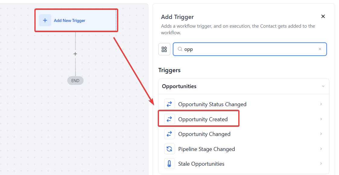 - Select “Opportunity Created” from the available triggers in the menu.