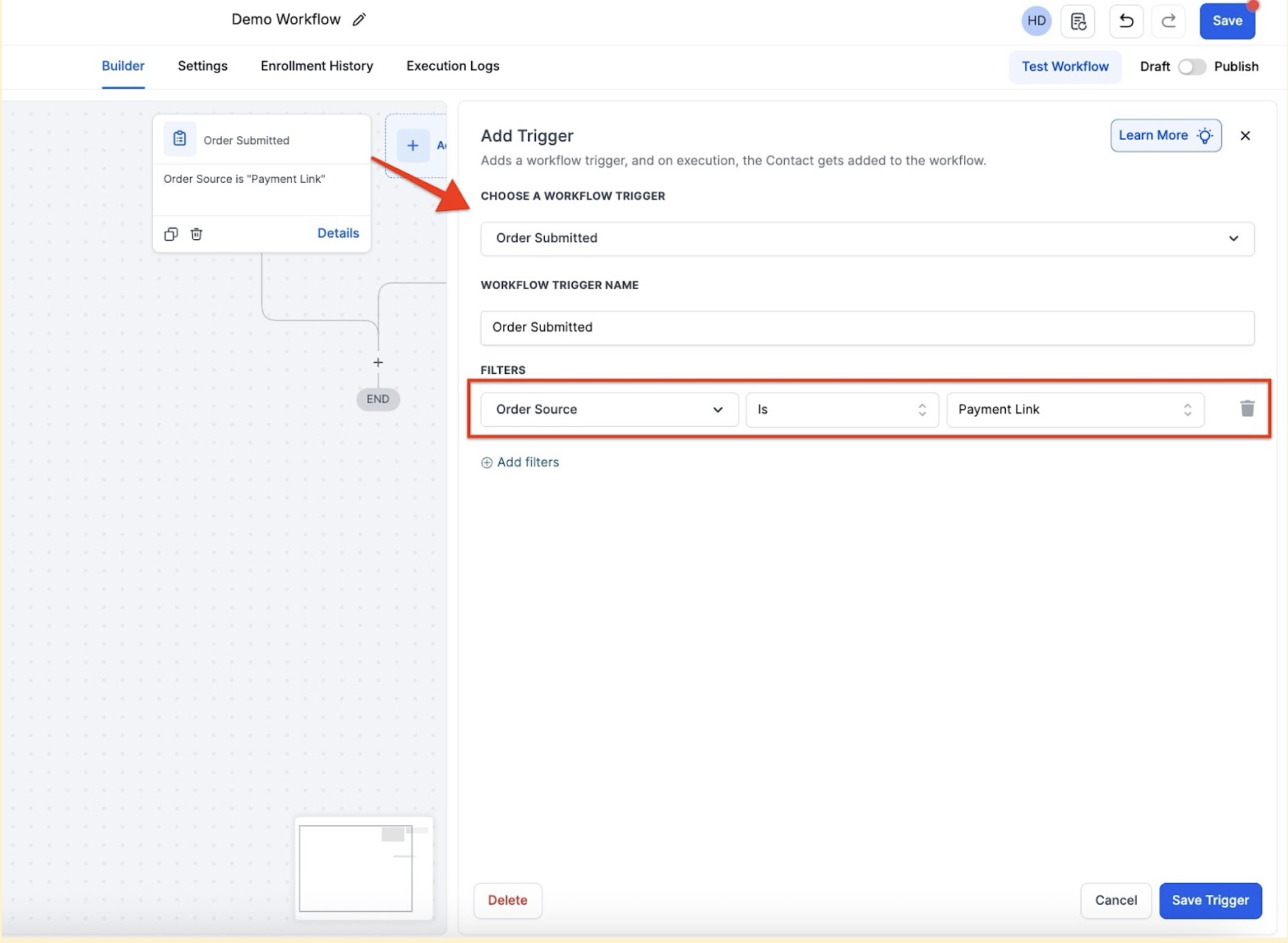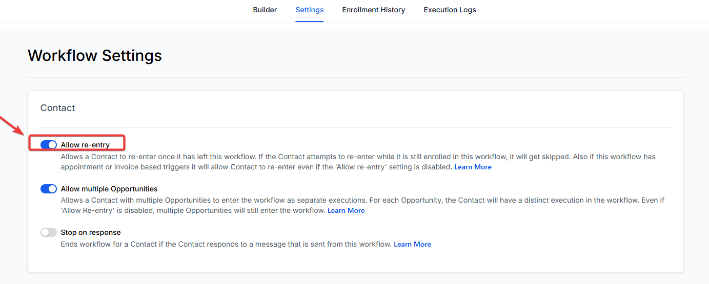 To allow the trigger to fire multiple times for the same contact (e.g., for an upsell right after primary product purchase), ensure the “Allow re-entry” setting is enabled in the Workflow Settings.