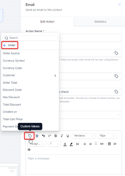 Please Note: Order-related custom values will only appear in the dropdown menu if the Order Submitted trigger is included as one of the workflow steps.