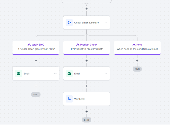 Step 2: Utilize conditions based on order or product details within the If branches to guide the workflow according to cart value, purchased products, or the specific funnel used.