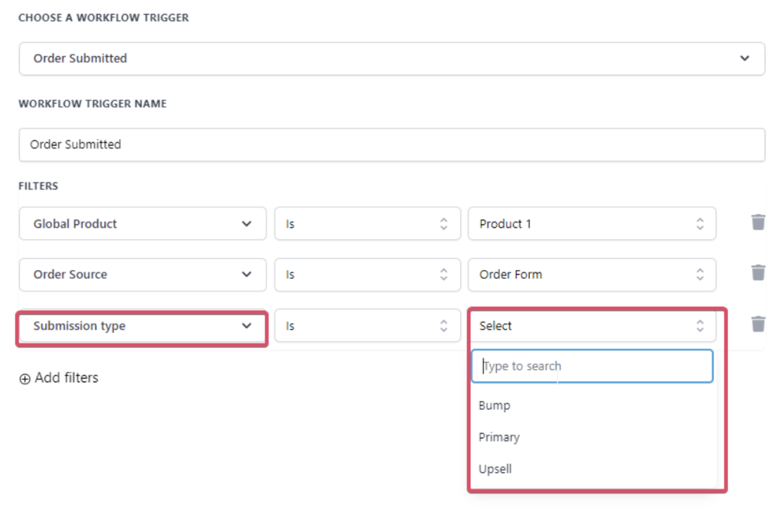 Section titled “How do submission-type filters work?”- Primary: Filters purchases of primary products during the checkout process.