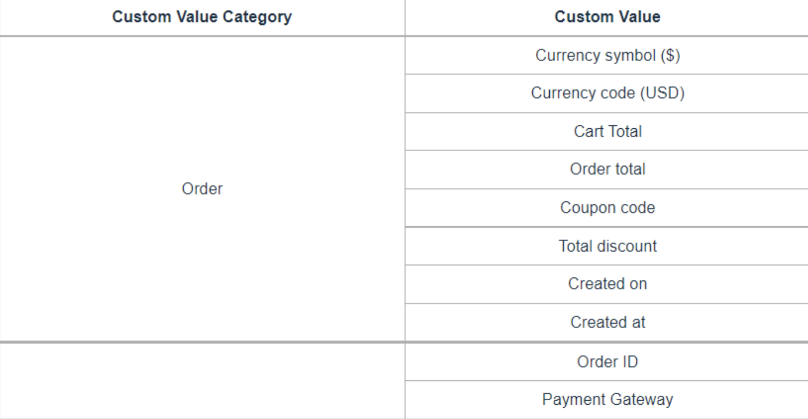 - Order-Related Custom Values: This trigger supports custom values related to customer details, order specifics, coupon information, and payment gateways, allowing for greater customization.