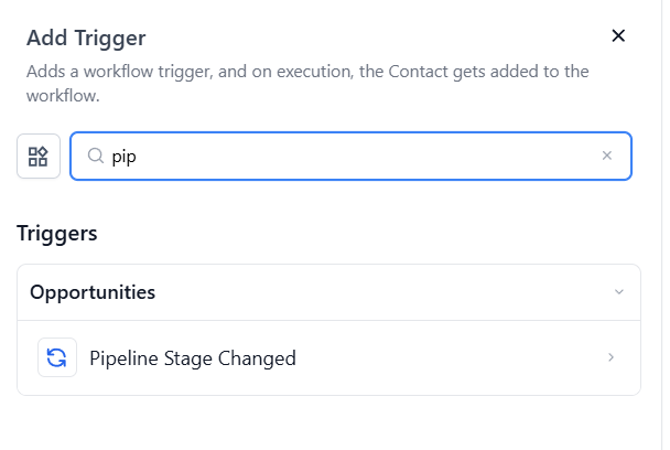 - Select Pipeline Stage Changed in the Opportunities section of the Workflow Triggers Menu or use the search feature. Once selected, the Trigger setup menu will appear