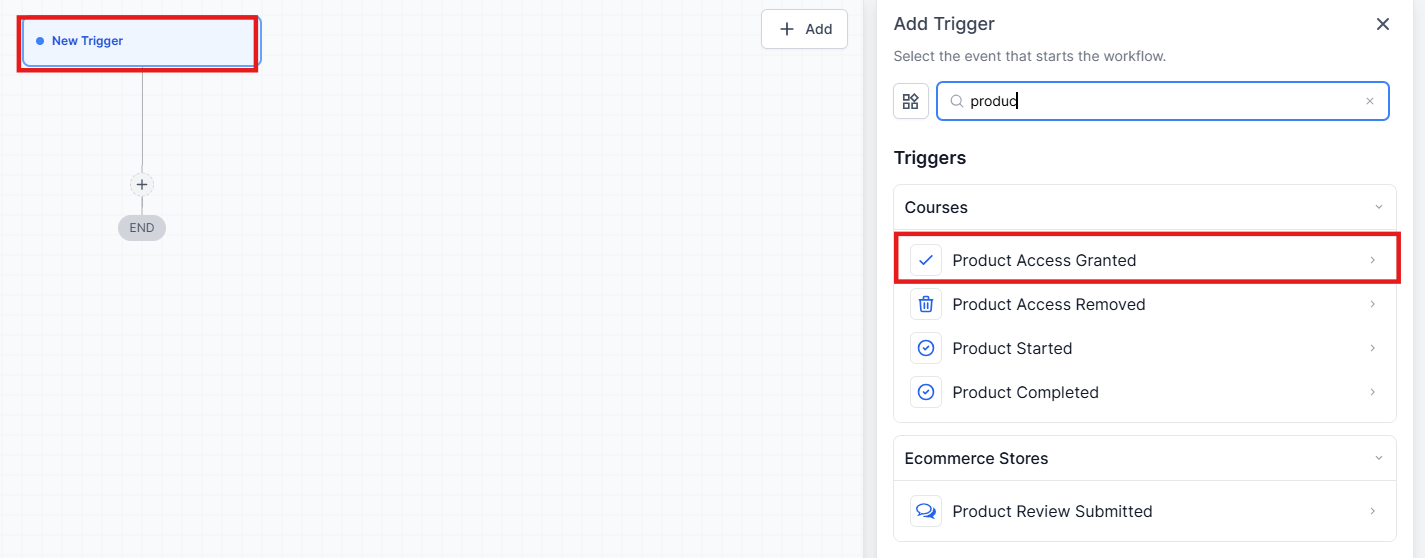 - Select Product Access Granted in the Courses section of the Workflow Triggers Menu or use the search feature. Once selected, the Trigger setup menu will appear