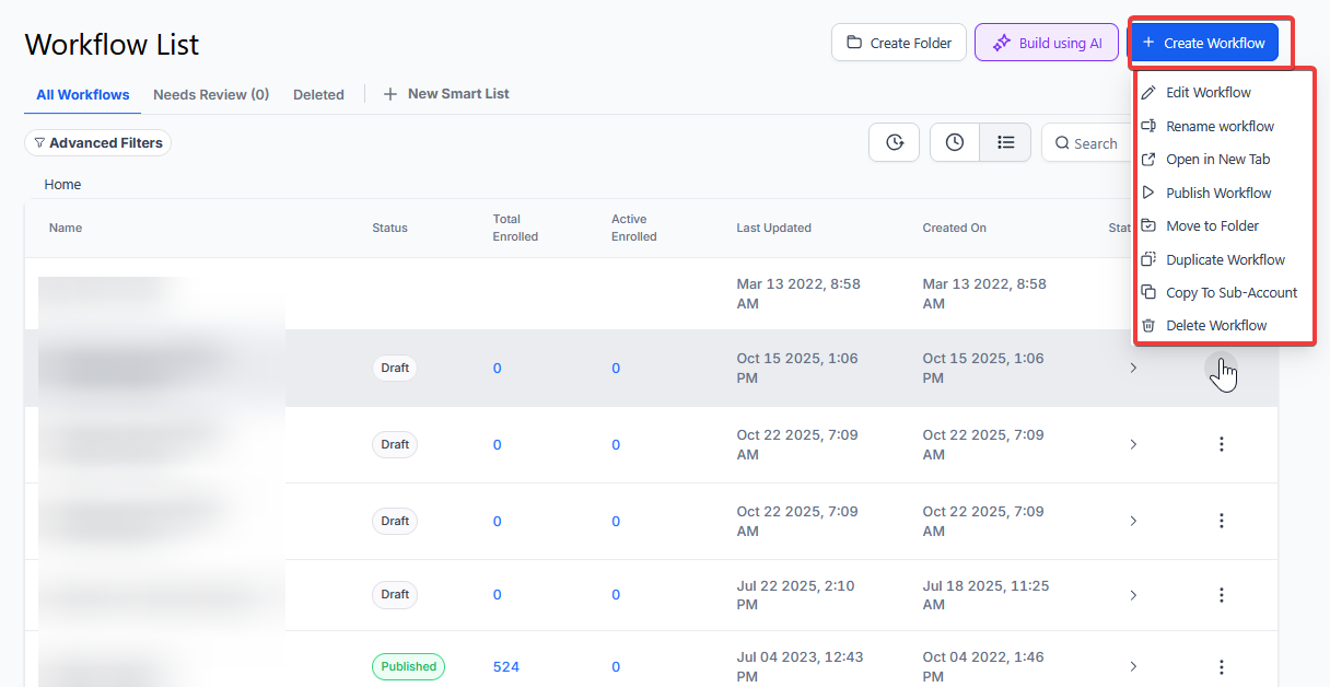 Section titled “Step 1: Accessing the Workflow Builder”- Navigate to Automation on the left > Workflows on the top and create a new workflow or edit an existing one