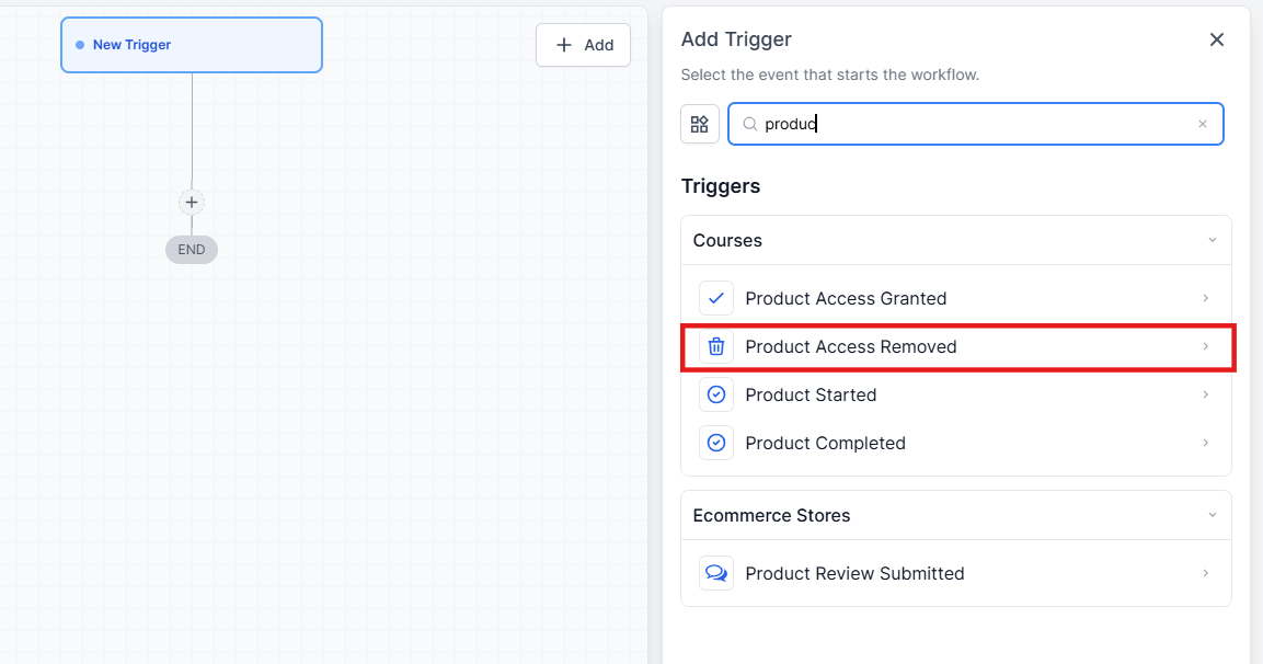 - Select Product Access Removed in the Courses section of the Workflow Triggers Menu or use the search feature. Once selected, the Trigger setup menu will appear