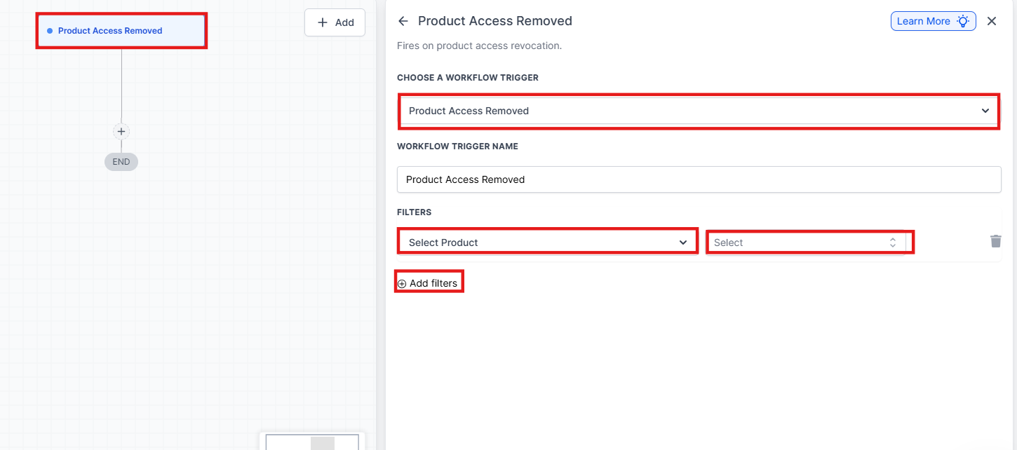 - The Select Product filter parameter will only allow this workflow to be triggered when a contact has access removed from a selected product
