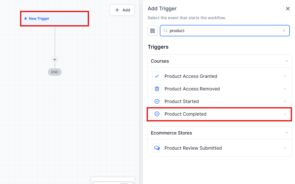 - Select Product Completed in the Courses section of the Workflow Triggers Menu or use the search feature. Once selected, the Trigger setup menu will appear.