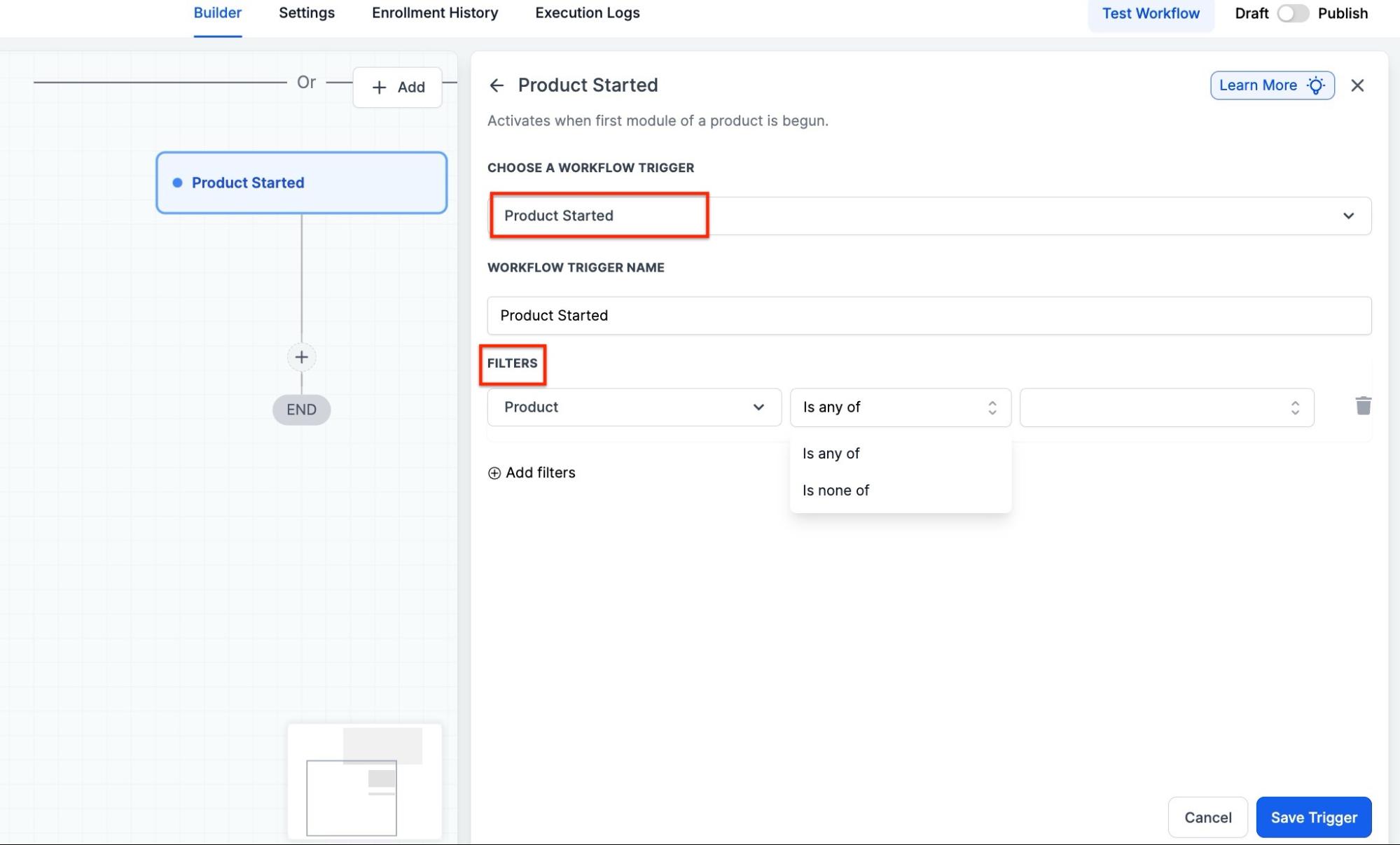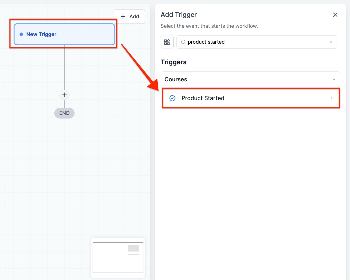 - Select “Product Started” under the Courses section of the Triggers menu.