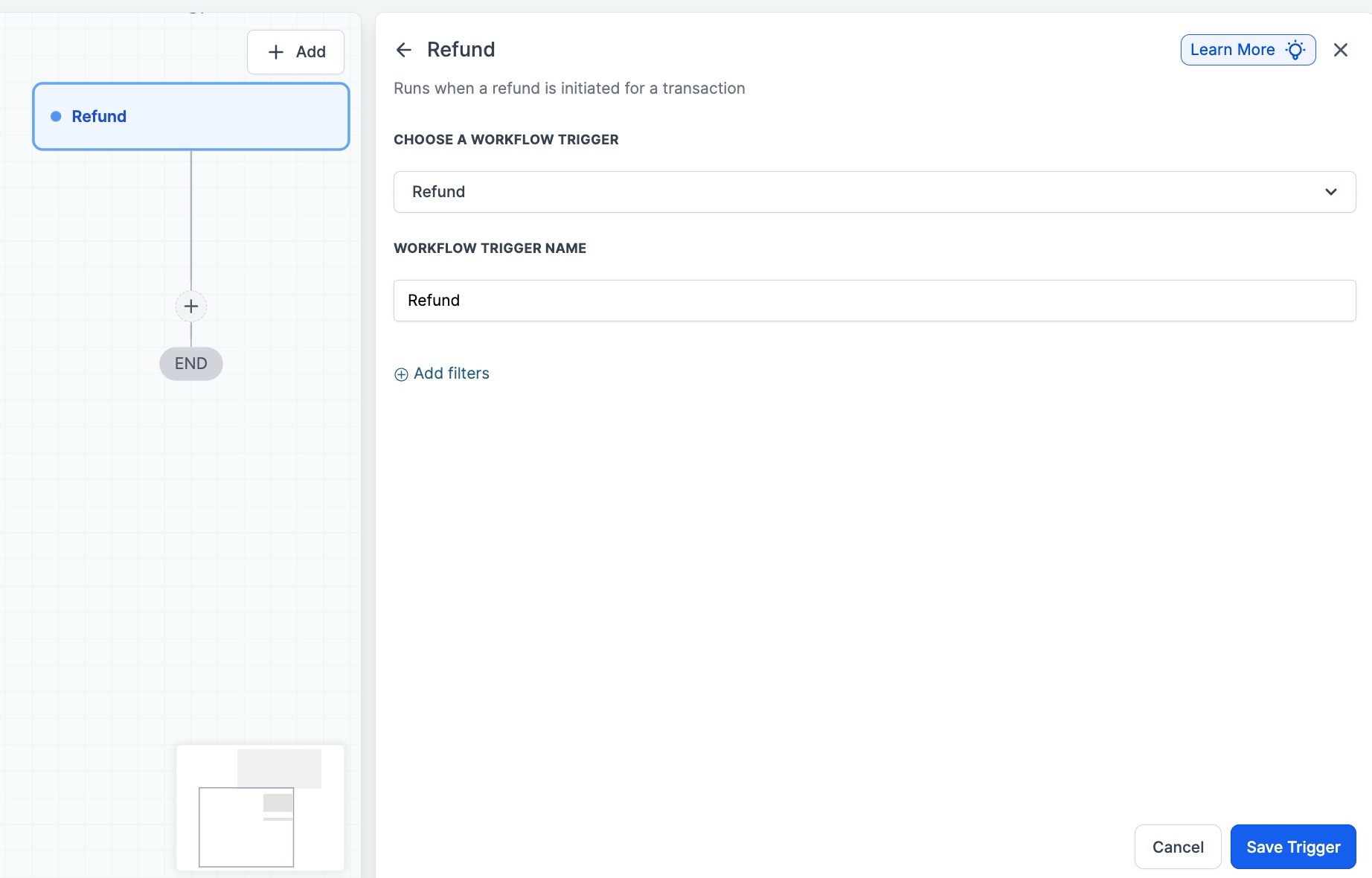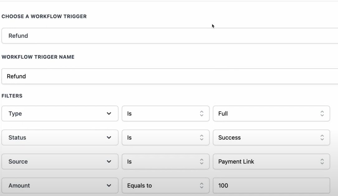 - Under the “Filters” section, define the specific conditions for the refund trigger. This includes selecting the refund event that should trigger the workflow, such as successful or failed refunds, full or partial amounts, or specific sources of the refund.