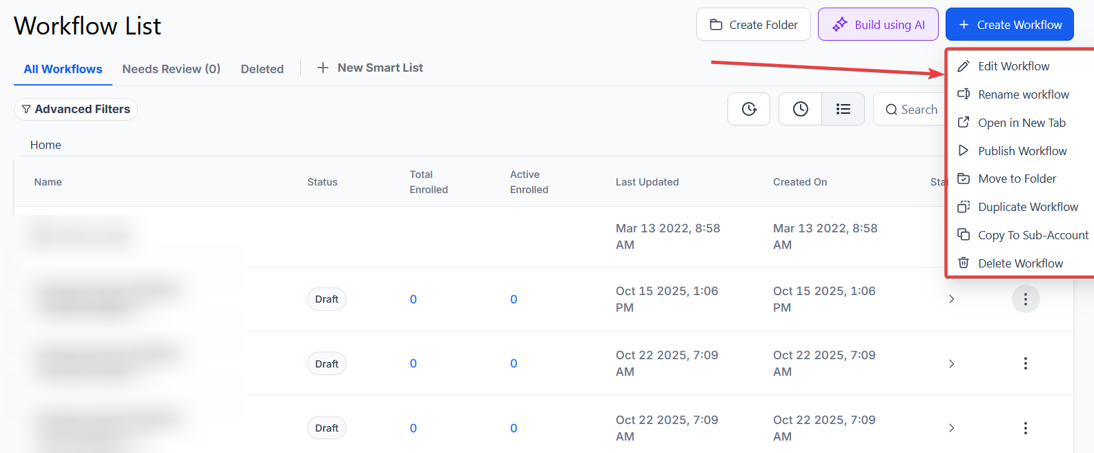 - Navigate to the workflow section within your platform and either create a new workflow or select an existing one to edit.