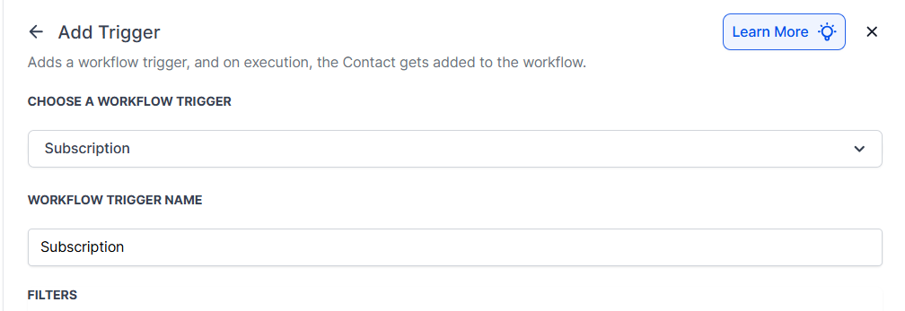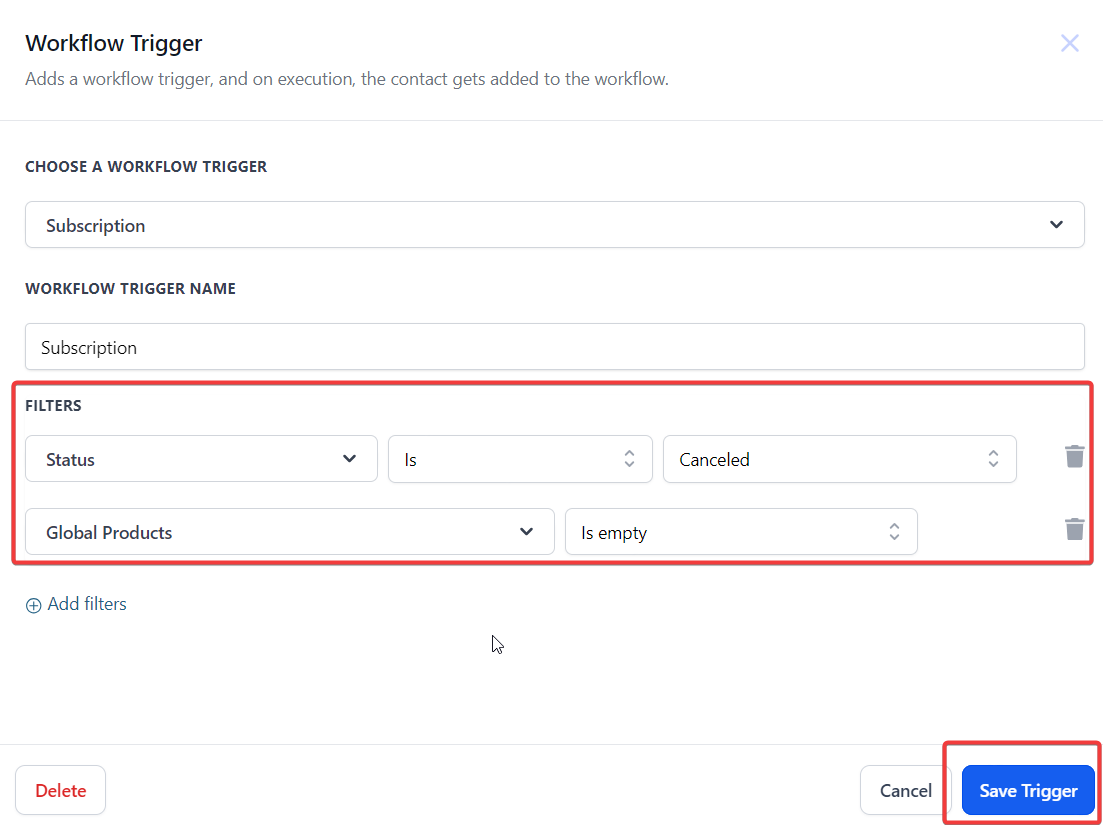 - Under Filters, define the specific subscription events that should trigger the workflow.