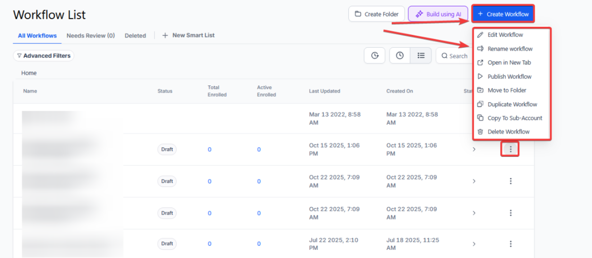 Section titled “Step 1: Start a new workflow or edit an existing one”- Navigate to Automation on the left > Workflows on the top and create a new workflow or edit an existing one.