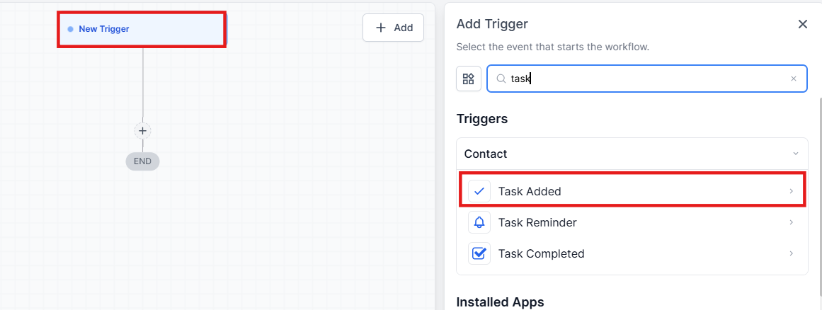 - Select the “Task Added” button in the Contact section of the Workflow Triggers Menu or use the search feature. Once selected, the Trigger setup menu will appear.