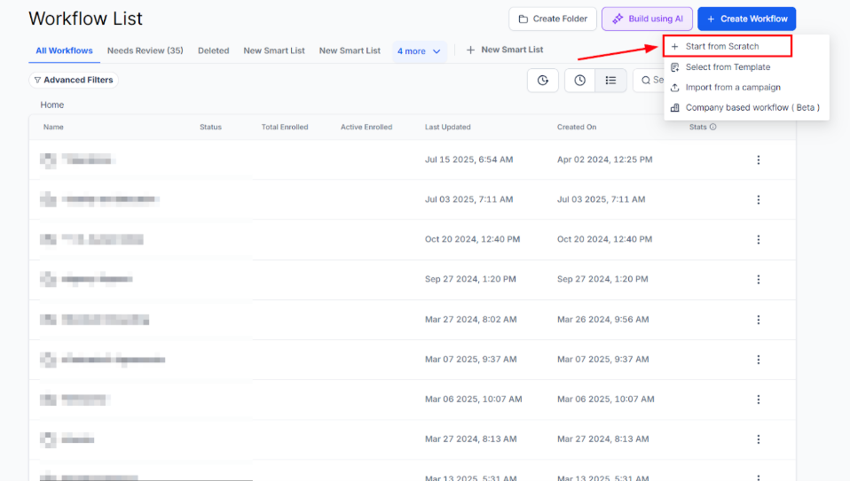 Section titled “Step 1: Start a new workflow or edit an existing one”- Navigate to Automation > Workflows and start a new workflow or edit an existing one