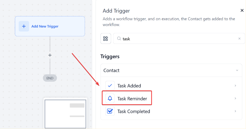 - Select the “Task Reminder” button in the Contact section of the Workflow Triggers Menu or use the search feature. Once selected, the Trigger setup menu will appear.