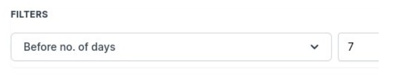 Question: What does the “Before No. of days” filter do? Answer: The “Before No. of days” filter sends a reminder a specified number of days before the task’s due date. For example, setting this filter to 1 day will send a reminder 1 day before the task is due.