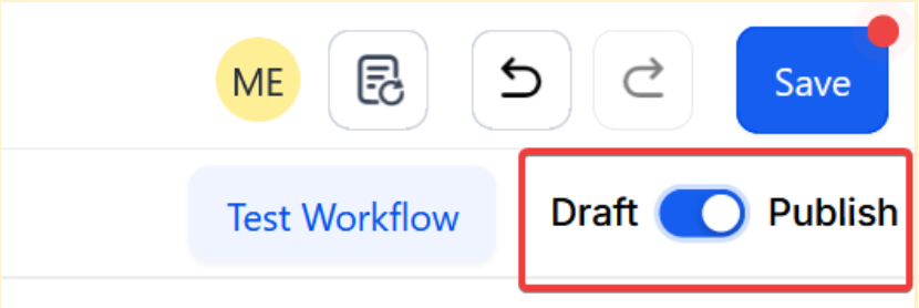 - Be sure to test your Workflow to ensure it is correct by using the Test Workflow button next to the Publish toggle switch.