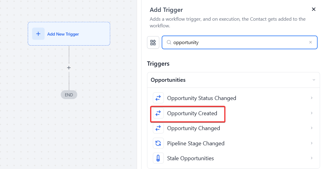 Select ‘Opportunity Created’ Trigger: Find and click on ‘Opportunity Created.’ This trigger runs when a new opportunity is added.